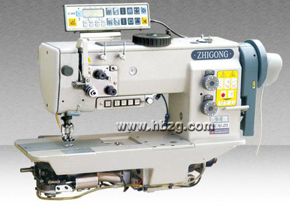 采用大型立式旋梭勾線、滑桿挑線;分為單針、雙針兩種機型,上下軸用軸承支承,同步齒形帶傳動,三同步綜合送料:機針、送布牙和壓腳交叉升降機構,保證在額定范圍內的任何長度針距下、縫紉滑性、粘性縫料及特長制品時上下層不位移、使縫制品整齊、線跡美觀。